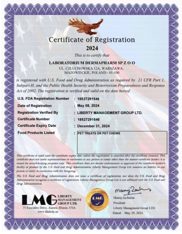 Мы рады сообщить, что наша компания получила сертификат Управления по санитарному надзору за качеством пищевых продуктов и медикаментов США (FDA) на производство лакомств для домашних животных. Сертификация FDA является ключевым подтверждением того, что продукция соответствует строгим стандартам безопасности, эффективности и качества, установленным Управлением по санитарному надзору за качеством пищевых продуктов и медикаментов США. Сертификат был выдан и проверен компанией Liberty Management Group Ltd. Этот сертификат является показателем высокого качества и безопасности продукции на международном уровне.